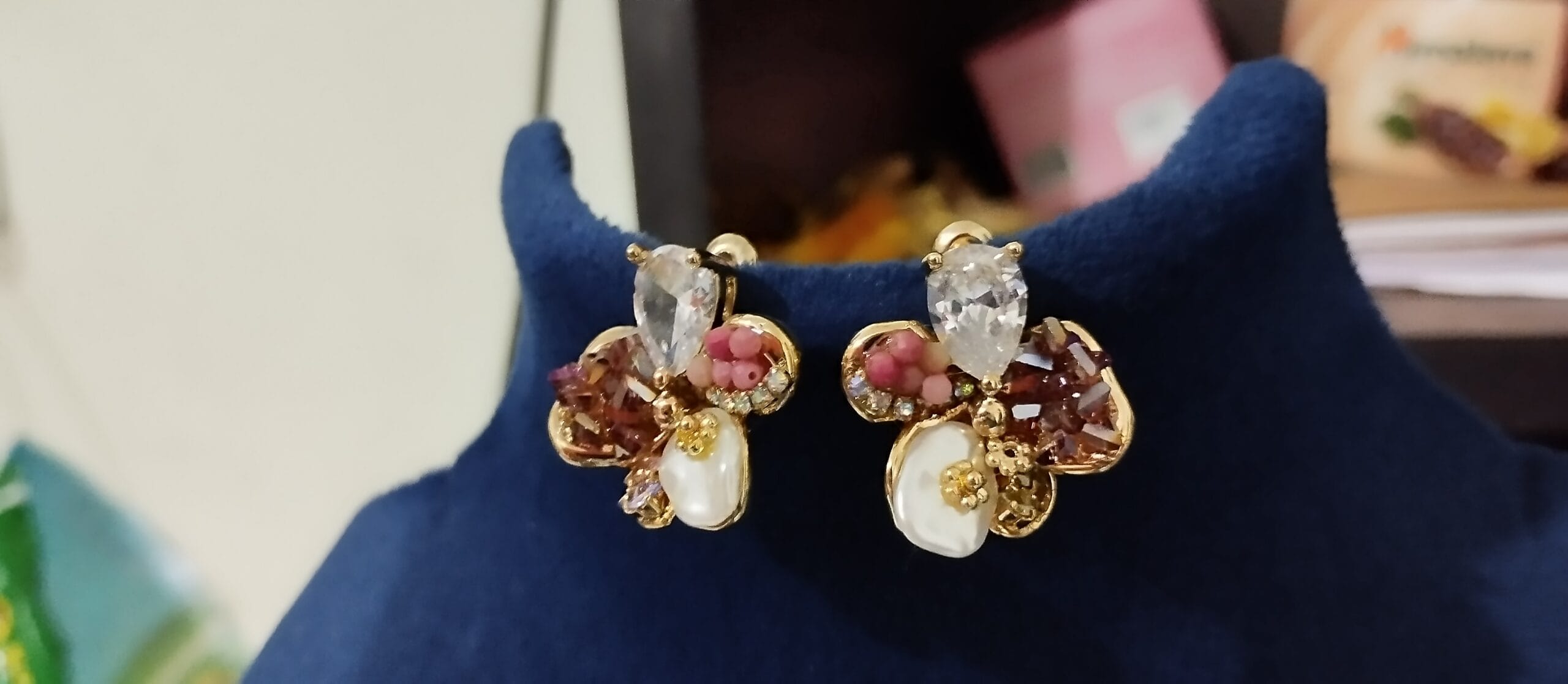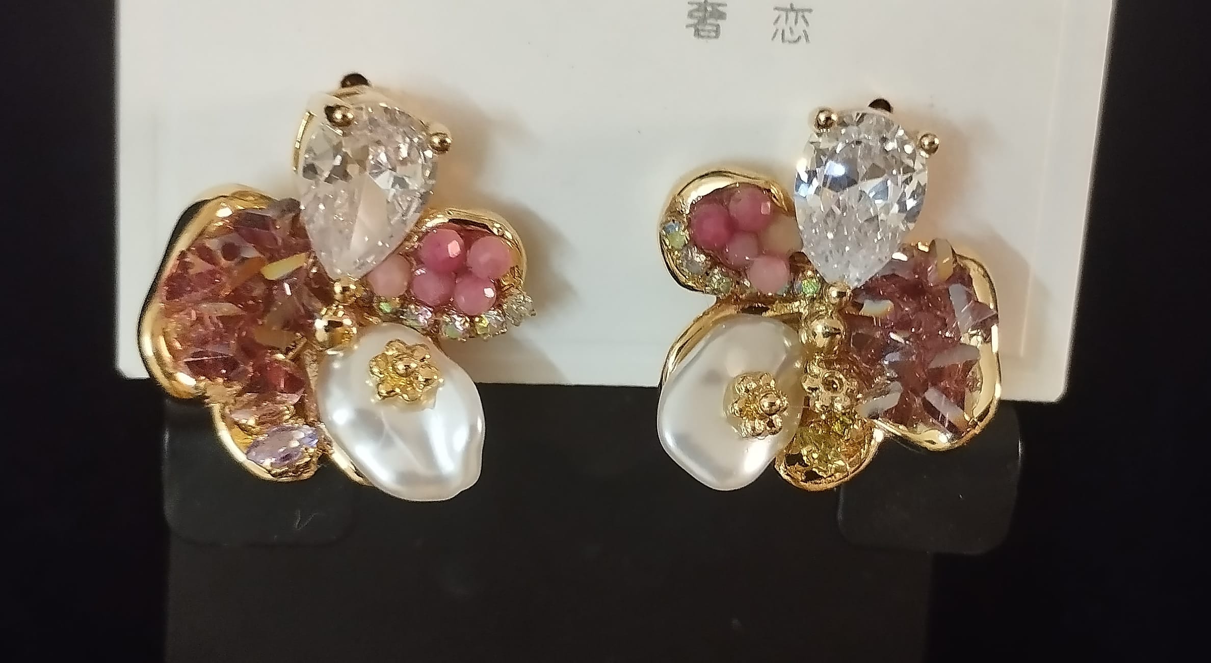 A dazzling fusion of elegance and charm, these sterling multi color imitation diamond ear studs are adorned with a medley of radiant precious gems in a captivating multi-color arrangement. Delicately outlined in gleaming gold, the teardrop-shaped clear stones take center stage, complemented by clusters of soft pink gems, iridescent details, and pearl-like accents. A perfect blend of sophistication and sparkle for any occasion!