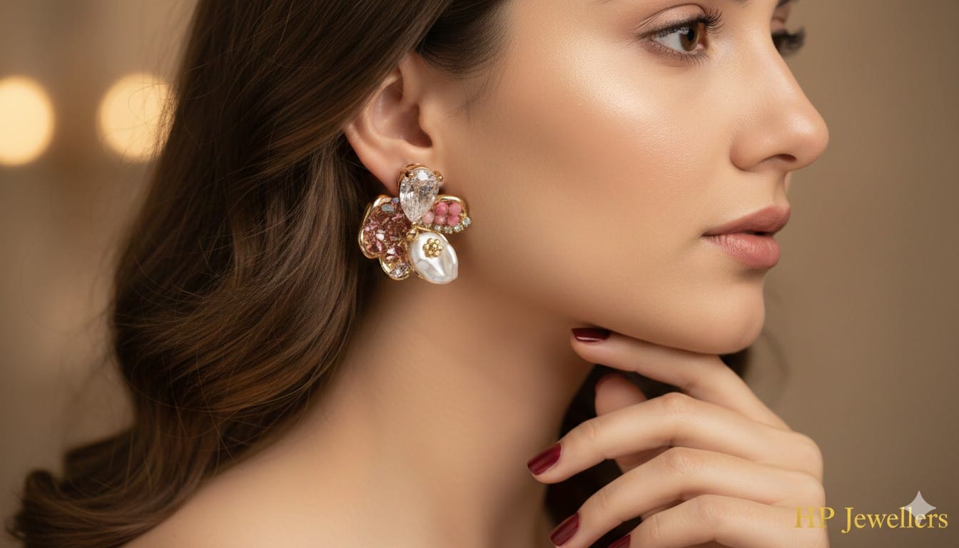 Coral, Pearl cutwork Diamond fusion Stone Earrings